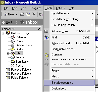 1. In Outlook, go to the Tools menu and click on Email Accounts.
