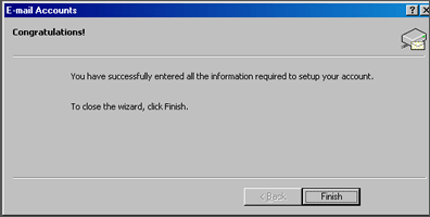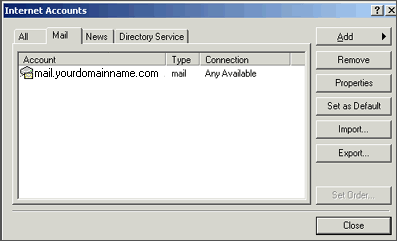 9. Click Next and then click Finish. After you click Finish, you should see the following window. If not, go to the Tools menu, and click on Accounts. After clicking Accounts the window will appear. In this window, click on your domain until it is highlighted, then click on Properties.